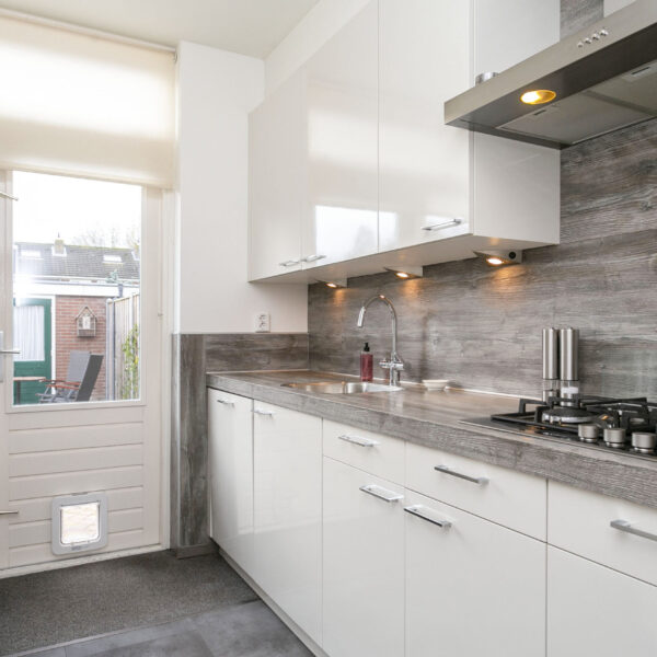 De lichte nette keuken is voorzien van een 4-pits fornuis, een 90cm brede afzuigkap een Itho Daalderop boiler voor de Quooker, een vaatwasser, een combimagnetron/oven en een koelkast. De keukendeur biedt toegang tot de 15 meter diepe tuin op het zuidwesten. De kozijnen zijn geplaatst in 2013 met HR++ glas.
