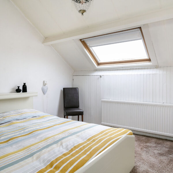 De tweede verdieping heeft een voorzolder en een ruime slaapkamer met knieschotten. De C.V. Atag en de omvormer voor de 8 zonnepanelen zijn geplaatst op de voorzolder.